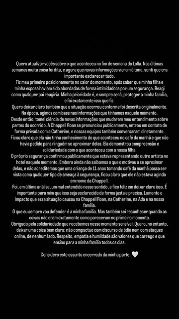 Since then, I have become aware of new information that has changed my understanding of parts of what happened. Chappell Roan made a public statement, reached out privately to Catherine, and our teams also spoke directly. It became clear that she had no knowledge of what took place at breakfast and had not asked anyone to approach them. She was understanding and sympathetic to what had happened to our child.