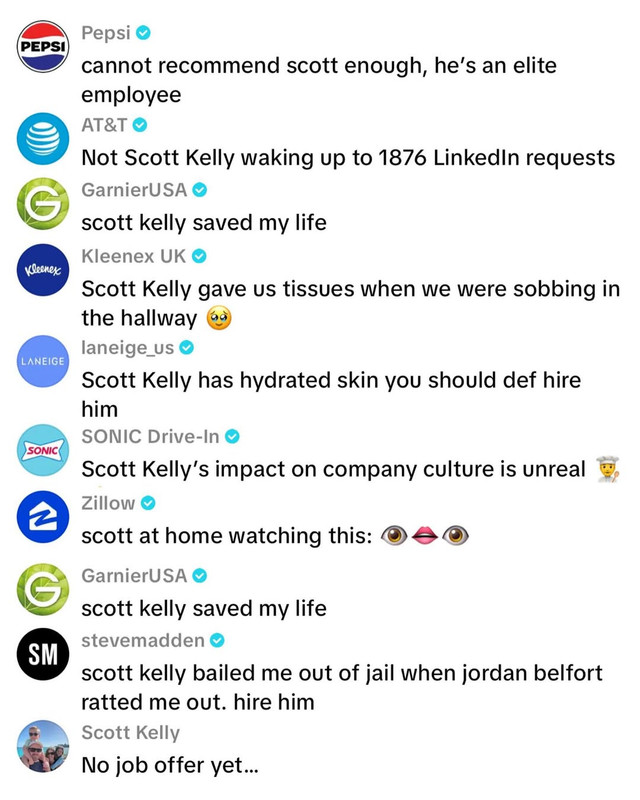 As The Washington Post reports -- there's a whole Post story on this shit, like it was Watergate -- the TikTok went viral overnight. Specifically, it became the kind of viral story beloved among the people who do social media posts for gigantic corporations. Many of those brands wished Kelly well in his job search in their own cutesy ways. Obviously, none of them offered him a job or money or anything remotely useful.